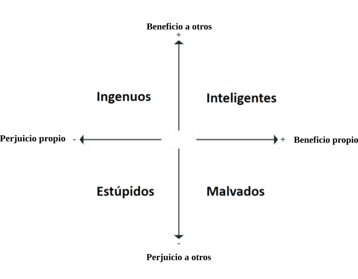 Carlo María Cipolla, escribió un famoso tratado de los efectos de la conducta humana en su relación con los demás, que queda simplificado en este sencillo eje de coordenadas, ofreciendo una clasificación del resultado beneficio/perjuicio propio y ajeno, que sería conveniente no perder de vista.