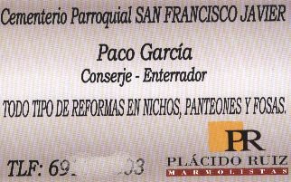 El hombre me dejó su tarjeta de visita (en la que ha tenido la habilidad de conseguir un patrocinador relacionado con la cosa fúnebre, como puede verse) pero pone enterrador. ¡Pues me niego!. Si todos somos tope modernos y chupi guays, reivindico que a los enterradores se les denomine T.E.M.I. (Técnico Especialista en Manipulación de Inertes).