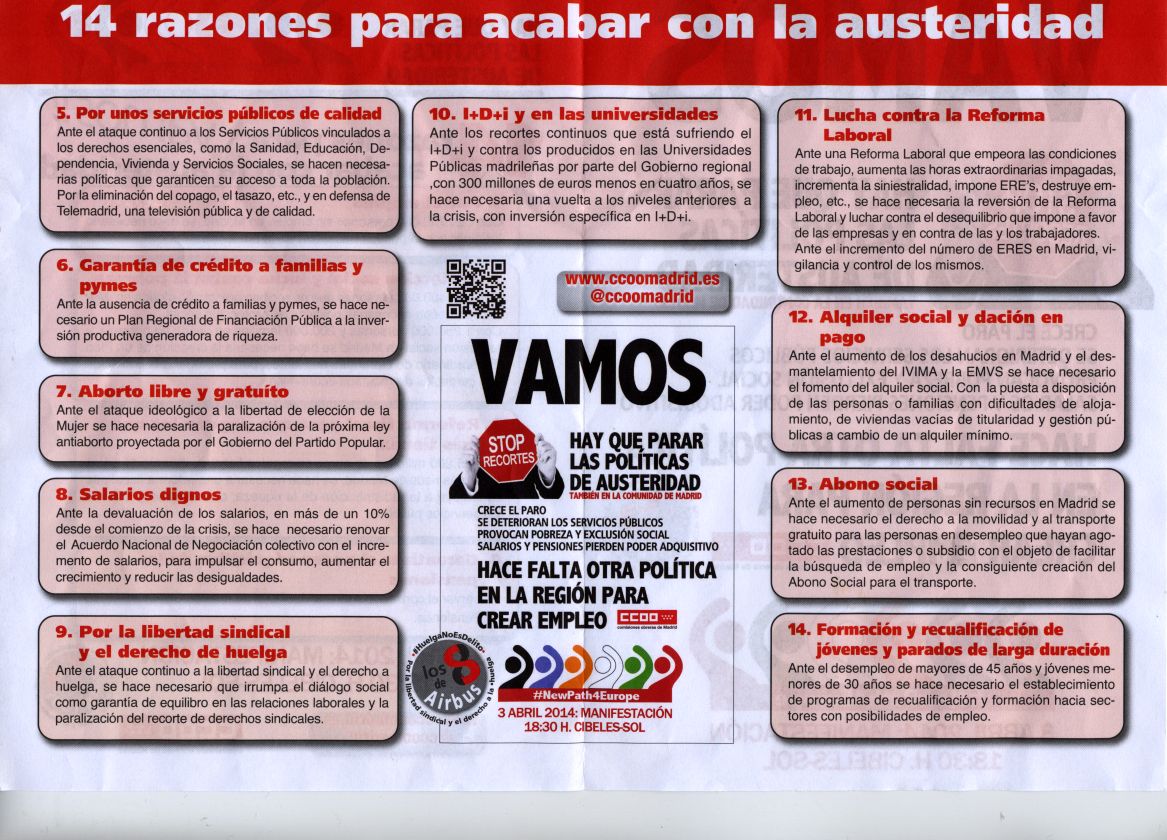 Ahora cae en mis manos un folleto sindicalista convocando a la peña para acabar con la austeridad, en el que pueden leerse «14 razones