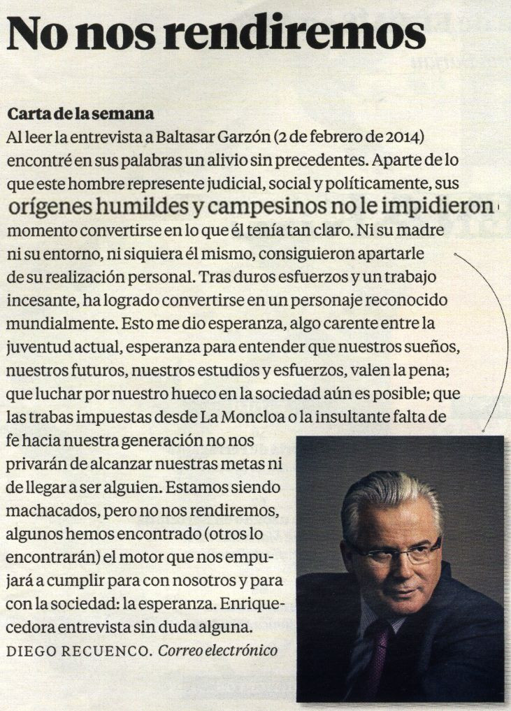 Leo en un ejemplar de Febrero de El País Semanal, en una sección llamada Correo que publica mensajes de los lectores, uno titulado «No nos rendiremos». El remitente hace una composición literaria emocionada sobre la esperanza, que modeliza con la figura del señor Baltasar Garzón, y glosa los valores de la no rendición frente a los machaques de Moncloa, etc. en lo que sería un clásico más.
